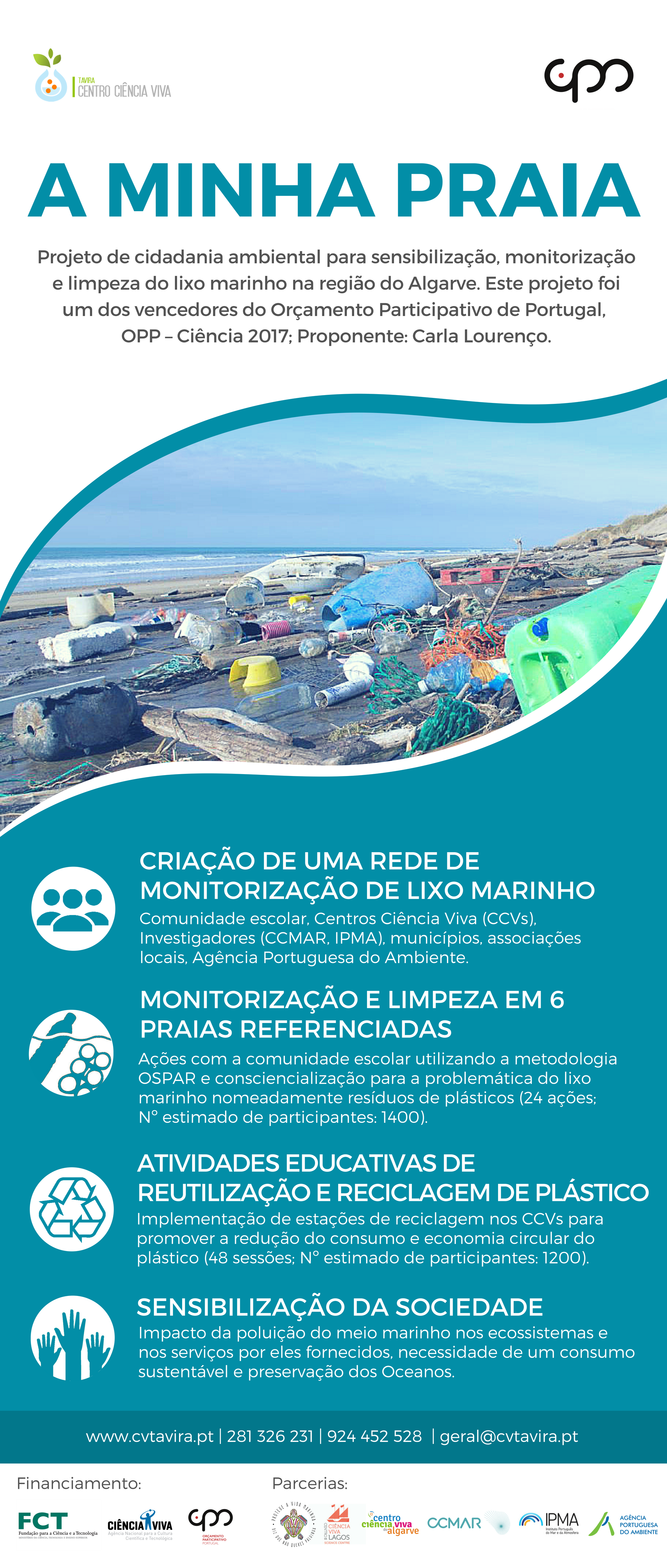 | dc.description.abstract | O projecto “A minha praia”, um dos vencedores do Orçamento Participativo OPP – Ciência 2017 pretende contribuir para a conservação do meio marinho e desenvolvimento sustentável com a criação de uma rede alargada de monitorização de lixo marinho ao longo da costa Algarvia. Através da cooperação de diferentes intervenientes (Centros Ciência Viva, comunidade escolar, Investigadores, municípios e entidades regionais) serão promovidas acções de ciência cidadã de: 1) limpeza e monitorização do lixo marinho de seis praias referenciadas da região; 2) actividades educativas de reutilização e reciclagem de materiais de plástico recolhidos em estações de reciclagem implementadas nos Centros Ciência Viva. Para além da obtenção de informação relevante para avaliação do lixo marinho encontrado nas praias (e.g. origem, quantidade, variação anual) este projecto irá contribuir para a sensibilização da sociedade e em particular da comunidade escolar para a problemática e impacto da poluição do meio marinho, nomeadamente por plásticos, nos ecossistemas e nos serviços por eles fornecidos e para a necessidade de um consumo sustentável e preservação dos Oceanos. Adicionalmente, contribuirá para a aproximação entre os cidadãos e a comunidade científica. | |