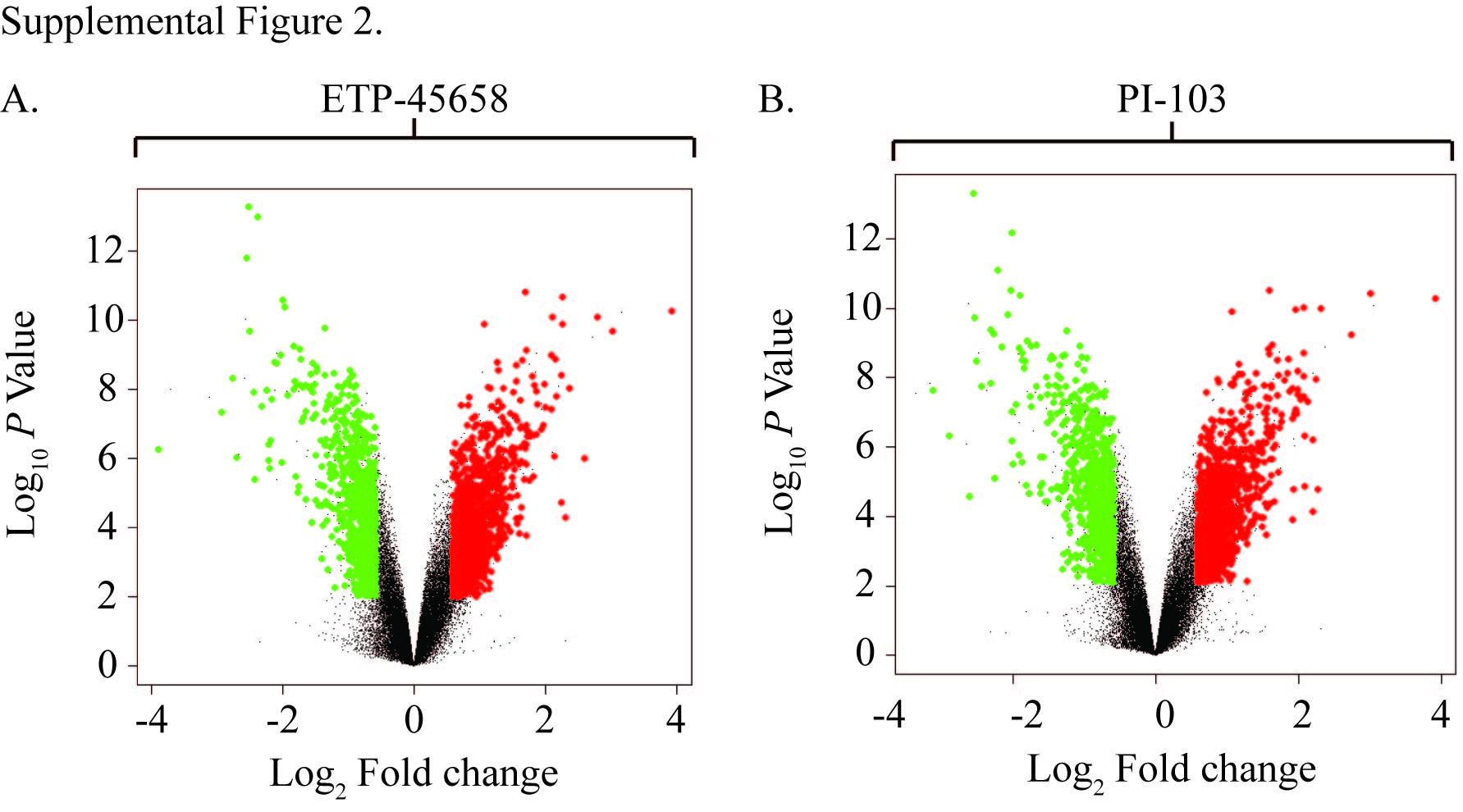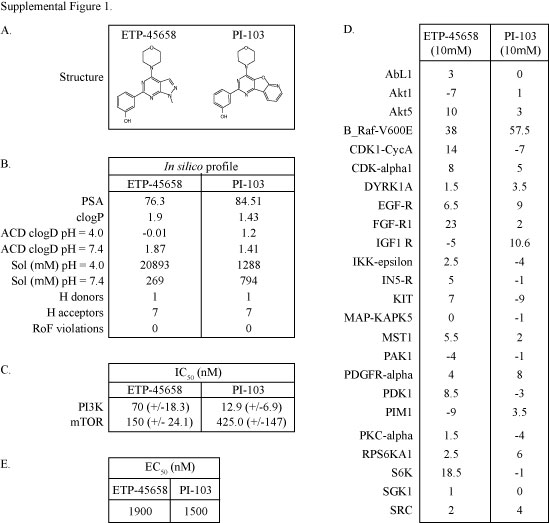 Results: We defined the physico-chemical and the biological properties of ETP-45658, a novel potent PI3K inhibitor. We demonstrated that ETP-45658 potently inhibited cell proliferation within a broad range of human cancer cells, most potently suppressing the growth of breast cancer cells via inhibiting cell cycle. We show that this response is Forkhead box O (FOXO) protein dependent and p53 independent. Our genome-wide microarray analysis revealed that the cell cycle was the most affected biological process after exposure to ETP-45658 (or our control PI3K inhibitor PI-103), that despite the multiple transcription factors that are regulated by the PI3K/AKT signalling cascade, only the binding sites for FOXO transcription factors were significantly enriched and only a subset of all FOXO-dependent genes were induced. This disparity in gene transcription was not due to differential FOXO promoter recruitment.