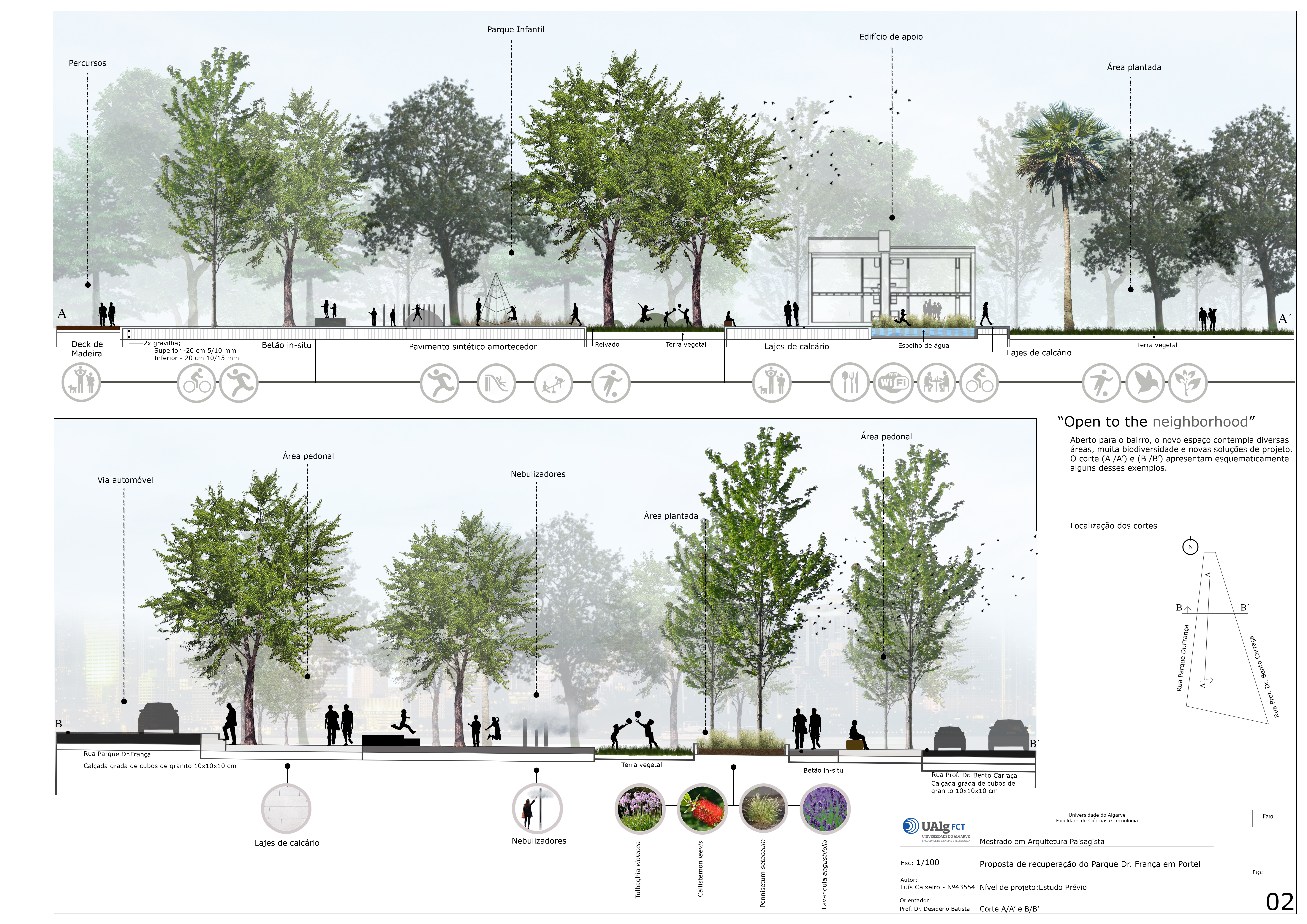 cortes e perspetivas, planta de pavimentos e mobiliário urbano, plano de plantação e